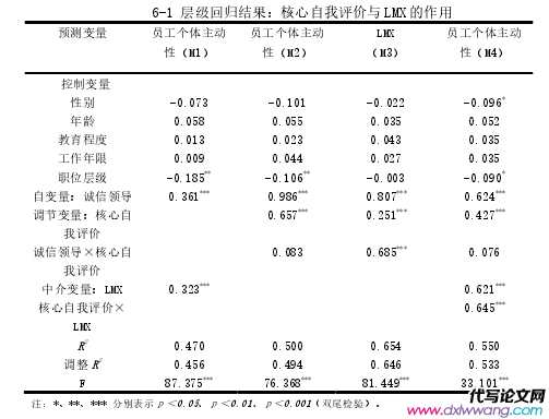 本研究在已有中介模型基礎上進一步考慮個體因素的影響,將核心自我評價引入中介模型中,探索核心自我評價對誠信領導與員工個體主動性關系的調節作用,并進一步探索核心自我評價對中介效應的調節作用,即構建一個有調節的中介模型,并對其進行驗證?;陬I導-成員交換(LMX)在誠信領導與員工個體主動性關系中存在中介效應,本研究擬進一步考察領導-成員交換的中介效應是否受到員工核心自我評價的調節。有調節的中介效應成立的前提是中介作用的總效應成立,且自變量與調節變量的交互作用對因變量不產生影響。在滿足此前提的情況下,研究采用 Muller 等提出的驗證有調節的中介效應方法,建立以下 3 個回歸方程來驗證有調節的中介效應。根據以上 3 個回歸方程式來判定有調節的中介效應成立。第一,誠信領導與核心自我評價的交互作用對領導-成員交換有顯著影響,即 a23、a34 顯著;第二,誠信領導與領導-成員交換的交互作用對員工個體主動性有顯著影響,即 a21、a35 顯著;第三,誠信領導與核心自我評價的交互作用以及核心自我評價與領導-成員交換的交互作用同時對員工個體主動性產生顯著影響,即 a23、a34、a21、a35 均顯著。依據上述步驟,首先,以誠信領導、核心自我評價及其交互作用作為預測變量,以員工個體主動性作為因變量進行回歸分析,檢驗誠信領導與員工個體主動性關系是否受到核心自我評價的調節。結果發現,核心自我評價誠信領導對員工個體主動性有顯著的正向預測作用(β=0.986,p<0.001),而核心自我評價對員工個體主動性具有顯著的負向預測作用(β= 0.657,p<0.001),誠信領導與核心自我評價的交互作用項進入回歸方程后,對員工個體主動性沒有產生顯著影響(β=0.083,p>0.05) ,詳情見表 6-1。
