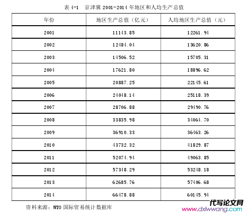 1970 年以前,服務貿易還沒有引起人們太多的關注,關貿總協定組織的多輪談判也都沒有考慮到要涉及這一議題。自 1970 年以后,其取得到了迅猛的發展,它的發展潛力和對一國或地區經濟的發展的重要性才逐步引起人們關注,其在各國貿易中的占比也在不斷增加,并且成為當代國際競爭重要內容,其在世界市場中是否具有競爭力直接影響到一國或地區在世界競爭市場中的地位。隨著人們對服務貿易關注程度的不斷提高,它的經濟地位日益加重。因此各國都積極發展本國的服務貿易,并融入國際市場,促進了世界服務貿易的進出口額的逐漸增長。其中,1980-2014 年進口額由 4036 億美元增長為 47405 億美元;出口總額則從 3671 億美元增長到 48615 億美元。與此同時,我國的服務貿易也在迅速成長,甚至貨物貿易增長的速度都不及它,它在世界的服務貿易中所占的比重也在不斷增加。其中從 1992-2014 年,服務貿易的進口額由 44 億美元增長為 3821 億美元,比重由 0.5%增長為 8.1%,約增長了 15 倍;同一時期,出口額從 25 億美元增長為 2222 億美元,比重由 0.7%增長到 4.6%,增長了將近 6 倍。而京津冀地區作為中國北方經濟的增長極,工業化的發展對其起到了非常重要的作用。但在國家去除落后產能、提倡節約資源及減少污染物排放、減少霧霾的號召下,鋼鐵等資源性產品出口將受到很大影響,京津冀地區工業的發展呈現出不可持續性。因此,該地區將大力發展服務貿易作為一項重要任務。雖然,2001-2014年京津冀服務貿易的進出口額由157.02億美元增加到1364.6億美元,有顯著地增加。但是與長三角等區域的服務貿易還是有一定的差距。因此,該地區應該尋找影響服務貿易的發展的因素,抓住對外開放這一機遇,積極發展服務貿易,并且利用京津冀在經濟方面合作的契機,促進其服務貿易協同發展,從而提高競爭力的整體水平。