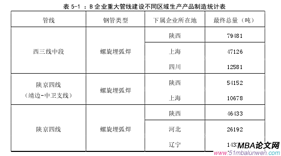 所謂產品的差異化營銷策略,就是指在提供產品時,能夠緊緊抓住消費者也就是客戶的心理因素,創造出區別于競爭對手的技術或者服務,使客戶能夠對產品產生共鳴。通過產品自身特點的凸顯,并能夠發揮其獨特之處。這是一種以自身的競爭優勢擊敗對手,贏得客戶認可度的一種營銷策略。[38]這種營銷策略的重點是企業擁有被全行業和顧客都認可并視為獨特的產品或服務。如何更好的發揮好產品自身的特點,在維護自身原本擁有的市場的同時,開拓新的市場,使客戶對自身的產品能夠記憶猶新,能夠讓自身的產品成為客戶的第一選擇,這是 B 企業所要深入研究的課題。那么對 B 企業而言,應當更好的發揮好自身的優勢因素,利用機會,在市場上穩固自己的地位。在現代的市場經濟條件下,B 企業應當致力于產品質量的提高和產品結構的優化,并隨著產品生命周期的發展而不斷的進行變化,為適應市場經濟的發展,及時靈活的進行適當的調整來迎合市場的需求,這樣才更有利于提高企業產品的競爭力。[39]根據產品差異化策略的分析,對于 B 企業螺旋埋弧焊鋼管產品而言,必須通過提供有競爭力的核心產品和有差異性的附加品來完成戰略目標的實現。對于 B 企業而言,最主要的在進行差異化營銷過程中,發揮好自己的三大優勢。一是地域優勢,二是服務優勢,三是技術優勢。關于地域優勢,前面已經講述,B 企業在建設的下屬企業,在全國各個地區基本上實現了全覆蓋。利用地區優勢獲取訂單,減少運費等成本,承攬大重點項目。[40]例如在承攬國家重點管線過程中,結合地區對訂單進行生產制造(見表 5-1)。