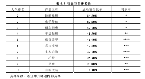 前裝是指在新車銷售前進行一些不影響汽車原有性能的施工,將一些原裝配件或者裝飾進行更換升級(比如用真皮座椅替換普通座椅,用實木替換普通內飾),或是加裝原來沒有的電子類產品(比如電子導航)?,F在的行情就是裸車本身已經沒有利潤可言,甚至有時候還可能因為款型或者顏色滯銷的原因需要虧損5%-10%左右來進行銷售。前裝的目的就是提高汽車銷售的利潤,彌補裸車銷售的虧損。首先分析研究前裝選項,選擇顧客接受度較高,同時利潤也較高的產品。這兩個特性缺一不可。選擇利潤高的原因顯而易見,如果利潤率一般就失去了前裝的意義。選擇顧客接受度高的原因,是避免因為前裝反而使原有的車型變成滯銷車型,假如前裝選擇了顧客并不愿意埋單的項目,原本想購買的顧客可能會遲疑猶豫,如果別家店有更好的選擇(加裝的項目能夠接受),就很有可能會失去訂單,得不償失。從精品部調取 2017 年所銷售的精品相關數據,按照銷量數量進行排序,得出以下結論。數據排列時,也特別標注了利潤較高的選項。