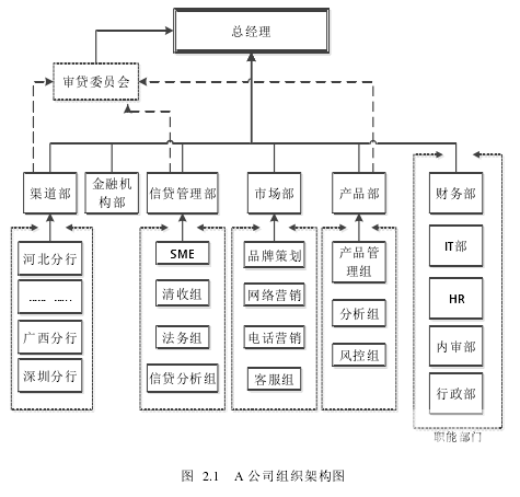 小額貸款A公司成立于2003年,是一家專門為個人、工商個體戶和小企業主提供免抵押免擔保、快速簡便的小額貸款咨詢服務的企業。屬于中國小額貸款行業的龍頭企業。目前在深圳、北京、河北、福建、四川、浙江等地有52家營業網點,千余名員工專門從事小額貸款業務。 A 公司目前共設十個部門:渠道部,財務部,IT 部,HR 部,市場部,金融機構部,產品部,行政部,人力資源部,信貸管理部;組織架構如圖 2.1:為上班族量身打造的快速簡便的小額貸款服務。申請條件為:20-60 周歲,中國大陸戶口的合法公民;在公司網點所在地居住或工作;現職工作持續 4 個月以上;月收入 2000 元以上(不同地區的收入標準可能相應調整)。貸款期限可選擇 12、18、24、30、36 個月.貸款額度最高 30 萬,每月等本等息還款。為微小企業主提供快速簡便的小額貸款服務。申請條件為:20-65 周歲,中國大陸戶口的合法公民;在公司營業網點所在地居住或經營;生意經營時間持續 6個月以上(部分行業可持續經營 3 個月以上)。貸款期限 6-24 個月可靈活選擇。貸款額度最高 50 萬,每月等本等息還款。