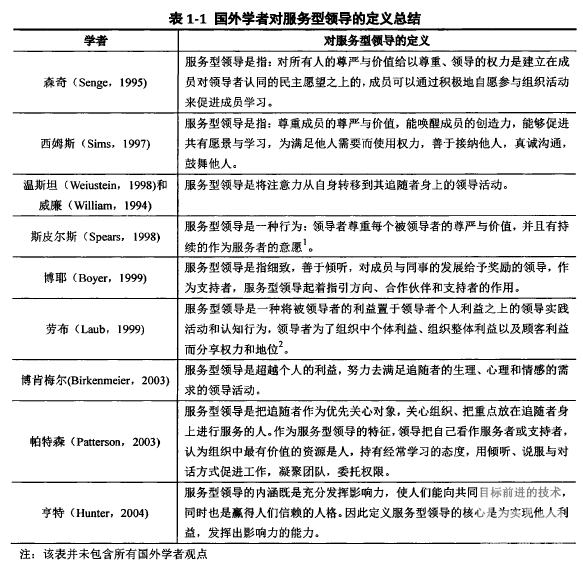 ?對服務型領導的定義由兩部分組成:對領導的定義和對服務的定義。對前者大家的認識比較統一,但對領導應該如何服務的問題,每個人卻有著不同的理解。后來的學者根據自己所處的社會環境、自己對服務的理解和研究對象的不同對服務型領導概念進行了各自的闡述。通過查閱文獻,我們將國外和國內學者對服務型領導定義匯總成表1-1。