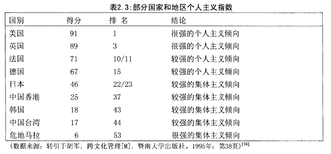 個體主義與集體主義是指人們對待集體和個人關系的傾向,即重視個人還是集體。我們可以用個人主義指數來衡量一個社會的個人主義或集體主義傾向。指數越大,說明該社會的個人主義傾向越明顯;反之則說明該社會的集體主義傾向越明顯。這個維度也很能很好地說明文化差異的問題。例如,中國的個人主義指數比較低,一直強調群體至上,注重人與人之間的關系融合。而歐美國家的個人主義指數較高,他們不大贊成在工作單位結成人與人之間的親密關系。表2.3是部分國家或地區個人主義指數統計: