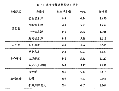 本部分將對高校畢業生擇業信息源對擇業意向的影響機制中的各個變量進行描述性統計分析,具體的有效樣本量、均值和標準差匯總在下表中。從表5.1中可以看到,自變量、因變量和中介變量的有效樣本量為648個,而控制變量的有效樣本量為216個,這是因為對于216個有效被試中,每個被試都填寫了三個公司對于本研究自變量、因變量和中介變量的情況。在后期實際相關和回歸分析中采用多層線性模型時,仍然根據216個有效樣本量進行分析,只是所有的648個數據匯總于多層線性模型的Level 1,而216個數據匯總于多層線性模型的Level 2。從均值上看,校園信息源的均值略低,而網絡、口碑和新聞信息源的均值均高于5。說明被試所選的三個企業在校園活躍度上總體表現一般,而在網絡活躍度、口碑和新聞上均較為活躍和正向。從擇業意向上看,均值為5.96,一部分原因是被試所選的三個公司更可能是自己平日比較關心的三個公司,所以擇業意向相對會較強。在擇業態度、主觀規范和知覺行為控制上,均值差異不大,標準差在1左右。對于內控型、機遇和有勢力的他人的考量發現,內控的均值比較高,為5.12,說明感知自己為內控型的被試占較多數,而機遇和優勢的他人均值約為4,與李克特七點量表的中值較接近,說明被試在對機遇和有勢力的他人的感知上分布較為均衡。