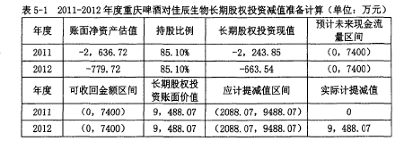 1998年,重慶啤酒欲要拓展業務范圍,將目光瞄準了乙肝疫苗行業(合成肽乙肝疫苗)》當年8月,與重慶第三軍醫大學共同出資設立了重慶佳辰生物工程有限公司(下稱“佳辰生物”)。佳辰生物其實自成立起就肩負著母公司重慶啤酒進軍疫苗行業的使命,可以說是“為研發治療用乙肝疫苗而生”。雖然主營業務涵蓋生物制品、化學藥品的幵發研究,但隨著乙肝疫苗研發將近失敗的消息頻出,佳辰生物一直處于被投入而不盈利的財務狀態。這與當時重慶啤酒預估的經濟效益相差甚遠,而重慶啤酒對佳辰生物的巨額投資,也將付之東流。重慶啤酒在2009年贈予股份后,持有的佳辰生物股權份額從93%下降至85.1%,但該項長期股權投資仍能達到對被投資單位實施控制。2011年末,佳辰生物的賬面凈資產估值為-0.26億元。重慶啤酒對佳辰生物的長期股權投資現值為-0.22億元。由于佳辰生物為非上市公司,對其財務數據主要通過計算和推測,2005年,重慶啤酒將持有的8%佳辰生物股權獎勵給吳玉章和邊疆。2009年,佳辰生物與授予人簽署的股權轉讓協議顯示,兩人獲得總計8%的股權,金額為696萬元。由此推算,2009年佳辰生物所有者權益的公允價值為0.87億元,則當年重慶啤酒的長期股權投資賬面價值約為0.74億元。但2009年正是疫苗研制如火如荼進行的階段,2011年研發失敗后,該長期股權投資賬面價值和未來現金流量必然低于0.74億元(表5-1)。