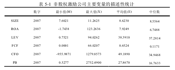 股利理論以及學者研究指出,影響公司支付股利的重要因素包括公司的盈利能力以及流動性(原紅旗,200132;楊淑娥,2000)。對本文的控制變量的描述性統計,如表 5-1、5-2 所表示:為了能夠進一步說明問題,統計了各個控制變量的樣本數、均值和中位數。如表 5-3,2011  -2013 年進行股權激勵的公司,公司規模(SIZE)、總資產報酬率(ROA)、每股經營性現金流量(CFO)、資產負債率(LEV)、市凈率(PB)、自由現金流量(FCF)的均值分別為:8.8206、9.5235、49.5320、36.8930、29.2550、0.6779;  中位數為 8.4160、9.0442、39.8707、29.1134、17.2411、0.1754。而沒有進行股權激勵的公司,公司規模(SIZE)、總資產報酬率(ROA)、每股經營性現金流量(CFO)、資產負債率(LEV)、市凈率(PB)、自由現金流量(FCF)的均值為:8.6230、7.9249、49.1890、38.3910、27.8760、0.6524;中位數為 8.5564、6.7488、34.9468、37.2814、16.7633、0.1171。