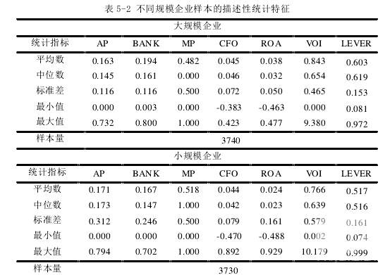 對近十年樣本數據中的變量做初步的統計分析,結果如下表: 表 5-1 分別從平均數、中位數、標準差、最大值和最小值五個方面對各變量進行統計性分析。商業信用(AP)的平均數為 0.182,中位數為 0.154,說明我國上市公司獲取商業信用的平均水平較高,從圖  5-1  中可以看出主要分布在0 到 0.2 之間,雖然最大值為 0.794,最小值為 0,差距比較大,但是分布比較集中。銀行信用(BANK)的平均數為 0.174,中位數為 0.159,其最大值為 0.800,最小值為 0,從圖 5-2 中可以看出數值集中分布在 0-0.2 之間,與商業信用(AP)相比,銀行信用(BANK)的平均數低 0.008,說明商業信用在企業經營性融資中占有重要的地位??幢?5-2,一是商業信用融資額,大規模企業的商業信用獲得額是 0.163,大規模企業商業信用獲得額是 0.171,說明小規模企業應付款項占總資產比例的平均值比大規模企業高 0.8 個百分點;二是企業銀行信用變量,大規模企業銀行短期信貸的使用量是 0.194,小規模企業銀行短期信貸的使用量是 0.167,說明大規模企業的銀行短期信用占總資產比例均值比小規模企業高 2.7 個百分點,這表明大規模企業比大規模企業更容易獲得短期信貸,此外,大規模企業的短期銀行信用獲取變量的標準差小于小規模企業,說明大規模企業信貸存量的分布波動相對較小,而小規模企業信貸存量的分布波動相對較大,說明小規模企業依賴于不穩定的短期信貸,資金約束較為嚴重;三是企業特性變量,大規模企業的盈利能力均值是 0.038,小規模企業的盈利能力均值是 0.024,大規模企業比小規模企業高 1.4 個百分點,標準差低 11.1 個百分點,表明小規模企業的盈利能力參差不齊,經營業績隨時間波動較大,且相較于大規模企業,其盈利能力較弱,具有高風險低收益的特點。大規模企業的營運能力均值是 0.843,小規模企業的營運能力均值是 0.766,大規模企業比小規模企業高 1.77 個百分點,表明大規模企業的資產周轉要比小規模企業快。