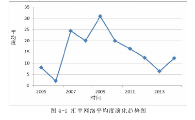 論文寫到這里已經接近尾聲,本文主要做了以下工作:利用復雜網絡理論,將匯率數據構建成網絡模型,并通過分析時間序列內匯率網絡平均度的演化趨勢,得出近年來匯率市場的波動狀況,發現匯率市場對于金融危機的反應比較劇烈。對匯率網絡度分布、集聚系數、平均路徑長度的綜合分析,發現匯率網絡具有小世界特性。并據此對匯率網絡的穩定性進行分析,事實證明,匯率網絡具有一定的穩定性,遇到外部攻擊會很快恢復。對比匯率網絡平均度與全球經濟增長率、全球貿易指數的演化趨勢,發現當匯率市場波動關聯性高的時候,全球經濟增長率以及貿易指數的數值都比較低,而在其他時期三者演化趨勢都比較平穩,一定程度上證明它們之間存在趨勢上的負關聯。計算出每種貨幣匯率波動率的標準偏差,并用這 47 種貨幣同時期的標準偏差的平均值來反映匯率市場波動水平的變化,結果證明匯率市場波動相對于匯率市場波動關聯性來說具有一定的滯后性,導致影響匯率的全球性指數與匯率網絡平均度之間的不相關。對匯率網絡節點重要性進行分析,統計出 2005 年第三季度到 2015 年第一季度所有季度網絡快照的重要節點,英鎊、南非蘭特等貨幣顯示出較高的重要性。對英鎊匯率相關的一些經濟變量進行相關性分析,發現直接標價法下的英鎊匯率與匯率網絡平均度之間存在顯著的負相關關系,也就是說英鎊升值會伴隨著匯率市場波動關聯性增強。我們統計出的重要節點大多數都有這種特性,并且不重要的節點或者處于中間水平的節點大多數并沒有這種屬性。