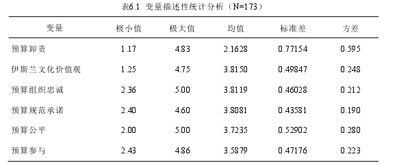 從 6.1 統計結果來看,預算組織忠誠和預算規范承諾的均值較高,分別為 3.8119 和3.8081,伊斯蘭文化價值觀的均值最高,為 3.8150,說明新疆地區多民族企業中,受伊斯蘭文化價值觀的影響較大;預算機會主義的后果預算卸責的均值最低,為 2.1628,說