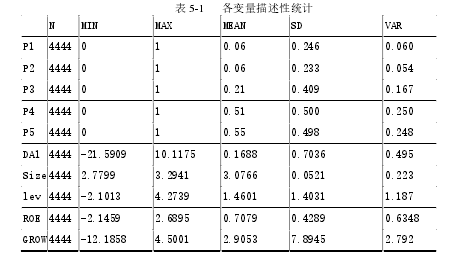 表 5-1 列出了 4444 個樣本的國有股比例、是否屬于管制行業、是否屬于房地產行業、是否享有稅收優惠、金融機構借款數額的多少、修正瓊斯模型、企業資產規模、財務杠桿、凈資產收益率以及企業成長性的描述性統計結果。從表 5-1 的變量描述性分析可以看出,在樣本企業中,國有股的中值為 0.06,說明所選擇的樣本中,在企業中國有股的占比很低。這說明在國有股企業中以及和沒有國有股的企業中,二者差別比較大,持有國有股的企業確實會在發展中收到政府的影響,包括政策法規以及認為因素的干擾。在是否可以進入政府管制性行業中,其均值為  0.06,說明在樣本中有 6%的企業進入管制行業,由此可見政府對管制行業的約束還是較大,企業想要進入管制行業難度較大,所以企業會努力和政府搞好關系,從而為自己能夠進入管制行業謀取利益打下基礎。在是否進入房地產行業中,其均值為 0.21,說明在樣本中有 21%的企業進入房地產行業,因為在眾多行業中,房地產行業可謂是極具暴利的行業,而房地產行業最重要的要素是土地,土地歸國家負責,所以很多企業會積極努力的與政府保持良好的關系,以此獲得對土地資源的需求。從企業是否享有稅收優惠來看,它的均值為 0.51,說明在研究的樣本企業中過半數的企業是享受國家與政府是稅收優惠政策的。從企業從金融機構借款的數額來看,其均值為 0.55,說明了樣本企業中大約有55%的企業都從金融機構取得過數額較大的借款,而企業也會借此展示自己與銀行的良好關系,以此來吸引廣大投資者和消費者。在盈余管理方面,修正瓊斯模型的  DA 的均值為 1.688,最大值與最小值之間的差額超過了 30,說明所選樣本企業中,進行盈余管理效果并不一樣,企業之間存在著巨大的差距。