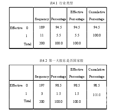 本文使用 SPSS statistics17.0 對所抽樣的 200 家上市公司進行描述性統計分析,由于行業類型、第一大股東屬性和兩職合一是虛擬變量所以單獨統計如表 4.1、4.2、4.3 所示。在樣本公司中,屬于壟斷行業的上市公司有 11 家,占所選樣本公司的 5.5%,這些公司在披露信息時,自愿性披露的程度不高;第一大股東是國有股屬性的有 3家公司,在所選樣本中占 1.5%,本文預測國有股屬性的公司沒有多大動力去進行自愿披露;其中董事長和 CEO 同屬一人的情況有 52 例,這種現象占到所選樣本的大約 25%以上,同時在樣本搜集的過程中還發現公司的 CEO 由副董事長擔任,這同樣會削弱董事會的監督功能,阻礙其自愿披露信息的行為。所選的200家樣本公司中,自愿性信息披露程度得分最低的為14分,經查詢這家公司為沈陽化工(000698),因為其從事稀缺能源方面的壟斷行業,故其進行自愿披露的程度比較低;最高值為23分,經查詢原始數據資料,知道這家公司為美的集團(000333),屬于電氣機械和器材制造業,其自愿性披露程度相對較高。本文將所選樣本按照自己構建的因變量評價體系進行評分,統計結果發現樣本的均值為18.19分,標準差為1.472。顯而易見,樣本公司總體的自愿披露信息的水平很低,并且披露的內容集中在幾個項目中間。