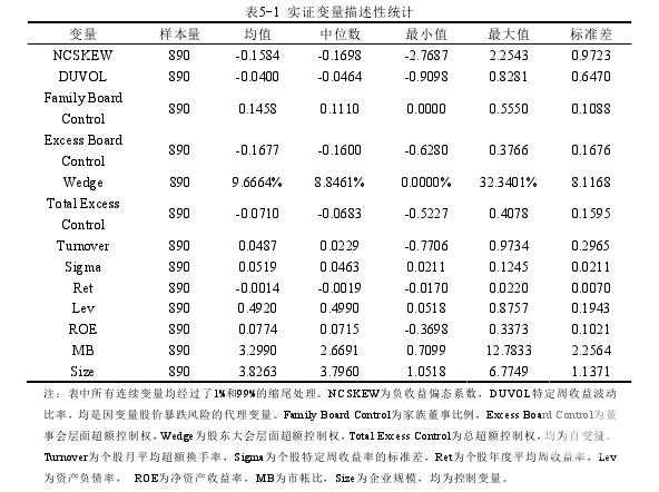 描述性統計是開展實證研究的基礎,通過觀察變量數據分布特征可以為進一步研究提供思路。文章根據第四章第一節列述的研究樣本標準選取了2010-2014年度(NCSKEW、DUVOL為2011-2015)共五年的A股主板上市的178家上市家族企業的數據,共890個觀測值。本文主要變量的描述性統計詳見表5-1,表格闡述了主要變量的均值、標準差、中位數、最小值和最大值等數據分布特征,所有數據保留四位小數。觀察表5-1可發現,因變量負收益偏態系數均值為-0.1584,中位數為-0.1698,標準差為0.9723。說明不同上市家族企業未來所面臨的股價暴跌風險存在較大差異。因變量特定周收益波動比率均值為-0.0400,中位數-0.0464,標準差0.6470,數據分布輕微左偏。自變量中,家族董事比例、董事會層面超額控制權、家族總超額控制權均值分別為0.1458,-0.1677,-0.0710,標準差分別為0.1088,0.1676,0.1595。股東大會層面超額控制權標準差為8.1168,這是由于每家上市家族企業控制權配置結構、最終控制人所有權比例各異,不同樣本企業的兩權分離度在數額上存在較大差別。觀察其余控制變量的數據分布特征也沒有存在異?;蛉笔У那闆r。 控制變量中,個股月平均超額換手率、股票年度周收益率的標準差、股票年度平均周收益率等數據分布與現有研究文獻基本一致,說明本文數據計算并無重大偏差。 綜上,分析本文主要變量的數據分布特征,大部分變量的標準差不算太大,數據分布較均勻,說明變量的整體取值不存在明顯偏差,數據較為準確,可以開展進一步的實證分析。